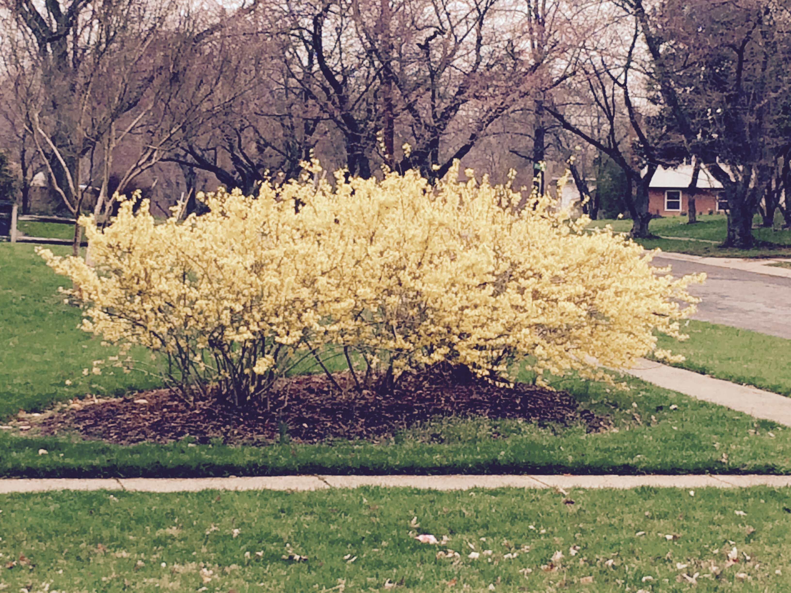 It’s early April and a damp, gloomy day out. Yet, in spite of the temperature being in the 40’s this morning, signs of spring are visible. When driving my daughter to the metro today I pointed out to her the forsythia in full bloom up and down both sides of the street. I told her how much my mother loved forsythia and how she always hoped it was in bloom when she and my dad visited me here in Maryland. My daughter and I talked about where we could plant some in our own yard. As happens most of the time, my thoughts turned to literature, and I asked her if she knew the poem “Forsythia” by Mary Ellen Solt. It’s a concrete poem, meaning the words of the poem are arranged in a deliberate way with some symbolic meaning or connection to the subject matter of the poem itself.