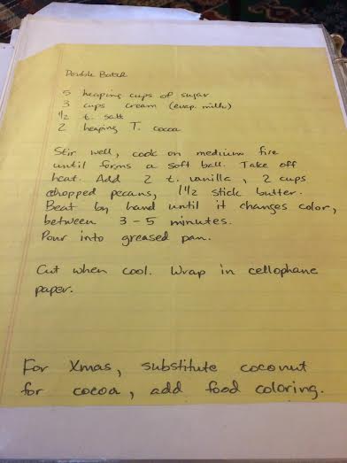 I have another recipe, in my own handwriting, which calls for “3 cups cream” and in parentheses I have written “evap. milk” to clarify. This recipe I believe came from my friend Donna West, whose father was the local dentist. He made the best chocolate fudge and I think this is his recipe. I can remember eating it out of a glass Pyrex dish standing at the counter in her kitchen.