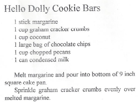 Another one of my cousin Penny’s sweet concoctions is the Hello Dolly cookie bar. This is no ordinary cookie, and could be used to test the levels of blood sugar after fasting, instead of the nasty glucose drink forced upon me when I was pregnant. It’s a simple layered cookie bar recipe: graham cracke