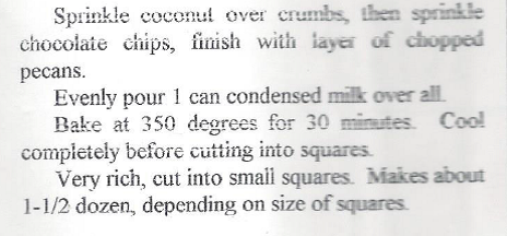 r crust, layer of chocolate chips, layer of chopped pecans, layer of coconut, and then topped off with a can of sweetened condensed milk drizzled over the top. After baking, it is necessary to let it cool before tasting, or risk burning the roof of your mouth from the caramelized sugary liquid glue holding the layers together.
