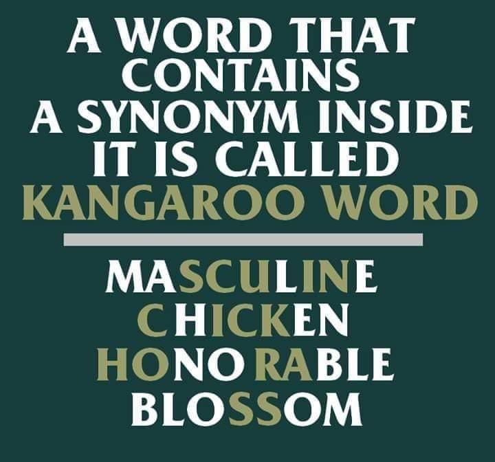 To understand this, just look at the white letters above. The word “masculine” contains within its letters the word “male” which is another word for masculine. So, the word “masculine” is a kangaroo word, and the synonym contained within it is the joey word. You know, like the baby joey is carried inside the mother kangaroo’s pouch.