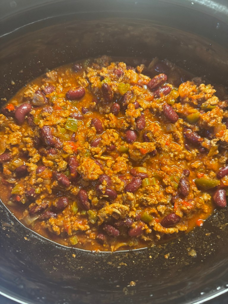 I no longer use the chili seasoning packet that was the foundation of Marcy’s Chili. I do cut my green and red bell peppers and onions in larger chunks like Shawna’s Chili. I make my own seasoning blend using chili powder, cumin, ground coriander, garlic powder, onion powder, paprika, crushed dried red peppers, freshly ground black pepper, and kosher salt. For two pounds of ground turkey I use one large can of whole tomatoes that I purée using my stick blender right in the can. I add two cans of drained and rinsed dark red kidney beans after the meat has browned and the tomatoes and spices have been mixed in. I squeeze out a couple of globs of tomato paste to give it a bit of body, and that’s it. Let simmer for several hours, refrigerate overnight, and reheat in the slow cooker for a few hours before serving time.