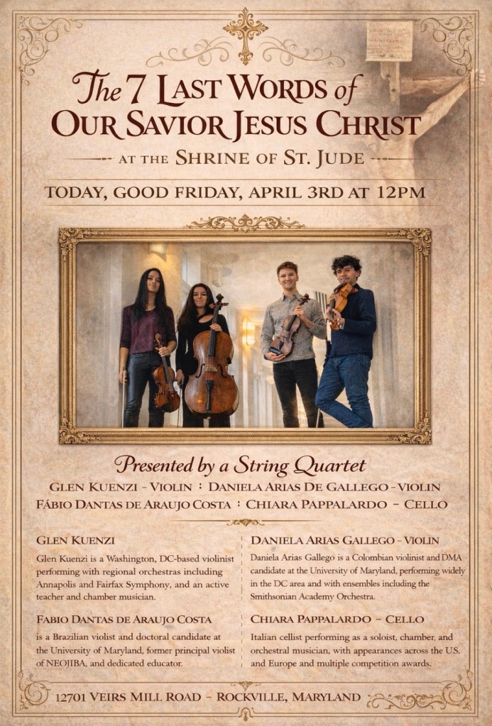 The string quartet, consisting of Glen Kuenzi, Fabio Dantas de Araujo Costa, Daniela Arias Gallego, and Chiara Pappalardo, presented the orchestral work by Joseph Haydn called the “Seven Last Words of the Savior on the Cross.”